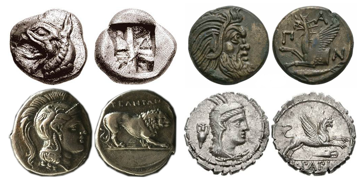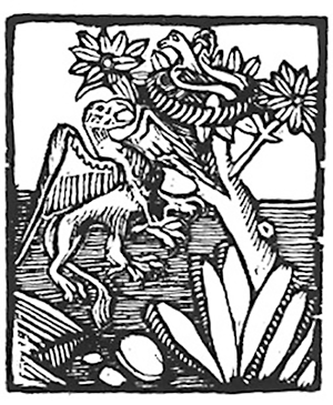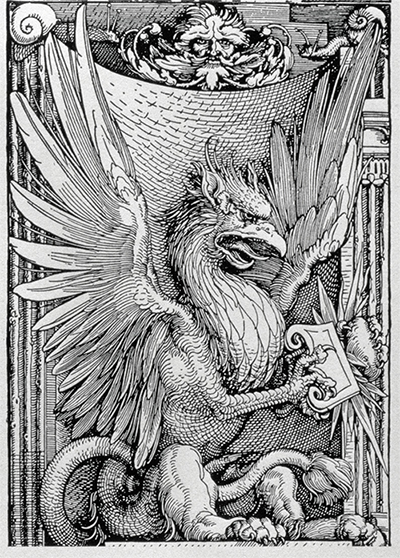 As the Gryphon is connected to the Sun/wheel/circle, it was also commonly depicted on coins. ![]() Coins, clockwise from top left: ![]() Woodcut of a gryphon, unknown artist, ca 1100. ![]() The Triumphal Arch of Emperor Maximilian I, Albrecht Durer, ca 1459-1519. (cropped) Later on in medieval bestiaries, where it was still thought of as a real animal, the Gryphon had a very distinct form. Oftentimes in the bestiaries Gryphons were pictured as devouring some kind of animal, usually an ox or a horse, to promote the creature as wild and beast-like, therefore "evil." The stance in the woodcarving to the left, called passant in heraldry, was common for many animals in bestiary pictures, as are the spread (displayed) wings. Another common attribute is the tongue protruding from the mouth, and it is also seen to the left. (The extended tongue and spread wings were actually widespread even before bestiaries were made, as you can see from the Gryphon designs on the statues, coins and vase above.) A more elaborate Gryphon is shown to the right, but notice still the extended tongue and the spread out wings. It should be noted again that in nearly all instances where gryphons were portrayed in art, they were depicted as very real creatures, with no more magical or unnatural abilities than any other natural creature of the world. The art of history has kept this noble and natural image of gryphons alive and well today. |
