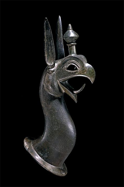 The Pectoral of Mereret catches the unique trait of the early Egyptian portrayal of the beast, the hawk head (sometimes that of a falcon). To the ancient Egyptians, the hawk was a most honored bird, and closely associated with the Sun, which would make it a natural choice to associate with the Gryphon. Late Egyptian art represented the Gryphon with an eagle head however. As early as 2,000 BC Gryphons were depicted on Egyptian tombs, and by 1,600 BC they wore the Atef, or White Crown, of Osiris, making the Gryphon the champion of Pharaoh and the guardian of the Egyptian kingdom. Later on, after influencing and being influenced by Hittite and Middle Eastern art, the Egyptian Gryphon obtained not only an eagle's head, but also loose curls flowing down it's neck. ![]() Cauldron fitting of a gryphon's head, ca 700-650 BC. ![]() Gryphon statue, ca 7th century BC. In Minoan Crete the Gryphon still served as protector and guardian, but seems to have achieved a more ornamental body. The curls described above went further down the Gryphon's back, ending at the base of the wings, if it was depicted with them. In the Palace of Minos at Knossos, a possible source of the mythic Labyrinth, colorful wingless Gryphons are presented not only on a fresco in the Throne Room, but also on a doorway to a shrine, and another fresco frieze. It is thought that Gryphons were somehow connected to the Minoan goddess (Magna Mater), since there are also depictions of priests leading Gryphons, of Gryphons pulling goddess' in a chariot, and of Gryphons guarding a goddess. The Gryphon appeared in all facets of Greek and Roman art and from time to time was portrayed with a conical knob on it's head as in the brass statuette to the left and the cauldron ornament to the right. The Greeks also had a tendency to curve the wings upward, as in left. A Greek bowl depicting two protective Gryphons, c. 500 BC Gryphons were common sights on vases, plates, bowls, relieves, etc., usually in the act of pulling a chariot, attacking an animal (mostly horses and stags), or serving as a protector, as in the bowl (c. 500 BC) to the right. Actually, the earliest example of "gryphomachy", or Gryphons attacking men, was on the back of a Greek mirror dated back to c.575-550. It was the stylized Gryphons on the helmet of a statue of the goddess Athena in the Parthenon which reminded Pausanias of Aristeas's poem, The Arimaspia. |