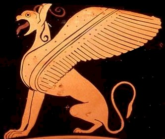 Another creature closely related to the Gryphon in both appearance and symbolism is the Sphinx. Sphinxes are generally thought of as lions with a human's head, though sometimes they have been found with other animal heads and even wings, which would make them look remarkably similar to Gryphons. Even their symbolism is mutual, since the Sphinx was regarded as the guardians of temples, and was sacred to the sun. And despite the common belief that Sphinxes are purely Egyptian, representations of the creatures have been found from Greece (as in the pic to the right) to the Yucatan. Due to the large number of similarities between the Sphinx and the Gryphon, it has been suggested that the two creatures have a common beginning. In fact, sculptures of Sphinxes appeared almost at the same time that ones of Gryphons did.
