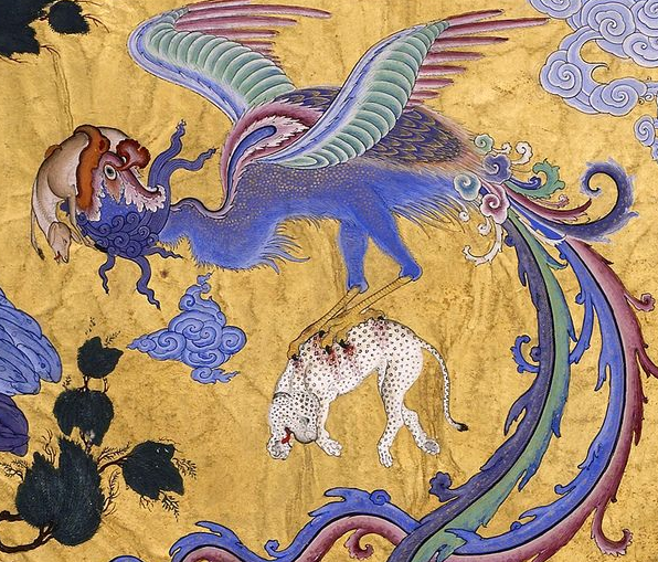 The Simurgh makes it's most notable appearance in the epic Persian poem, The Shah Nameh ("Book of Kings"), by Firdausi. It took 35 years to compose the massive (60,000 couplets long) poem, which was completed in 1010 as a gift to Mahmud, the Sultan of Ghanza. In the poem the wise old Simurgh finds a child, named Zal, abandoned at the foot of the unclimbable Mt. Alberz by his father who believed him to be the progeny of demons. The Simurgh takes care of and raises the child, teaching him the ways of the world. Many years later the Simurgh gives Zal one of his feathers when it is time for the boy, now man, to return to the world his father took him out of. Zal returns to his father and inherits his kingdom, ruling wisely with his new wife, Rudabah, by his side. When Rudabah is about to die in childbirth, Zal calls upon the powers of the feather and Simurgh appears to help the woman and she gives birth to the great Persian hero, Rustam.