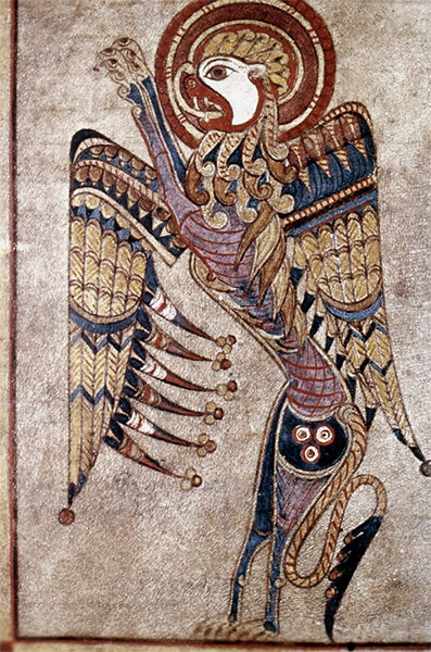 The joining of eagle and lion is a natural thought process, since we already associate them both with the regality of Birds and Beasts. Once you stop to realise this, you will find that there are many references to eagles and lions together, and thus Gryphons. One such example is the representations of St. Mark as a lion and St. John as an eagle from the 6th Century Book of Kells, a celebrated calligraphical work of the four Gospels. Writes Ben Mackworth-Praed on the four Evangelical Symbols from the Book,